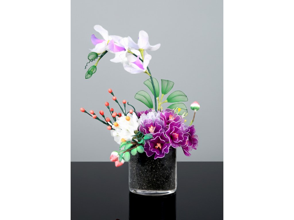 Květinová dekorace ručně vytvořená z nylonu a barevných  drátků umístěná v keramickém květináči s kamínky.