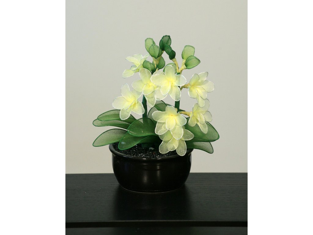 Květinová dekorace ručně vytvořená z nylonu a barevných  drátků umístěná v keramickém květináči s kamínky.