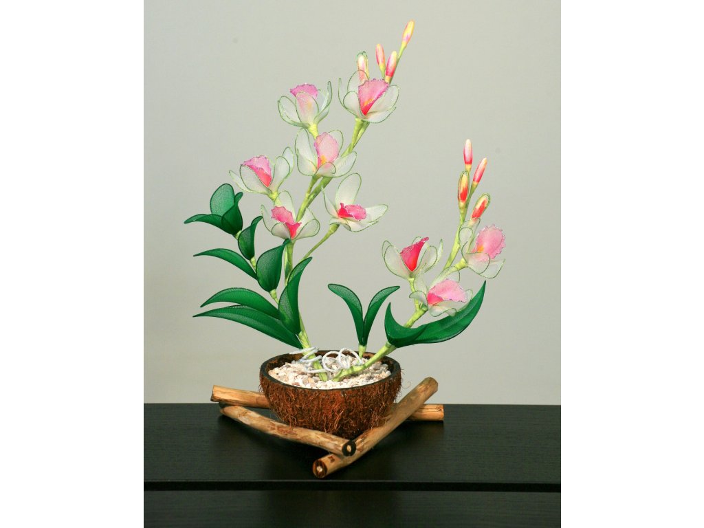 Květinová dekorace ručně vytvořená z nylonu a barevných drátků umístěná v kokosovém květináči s kamínky.